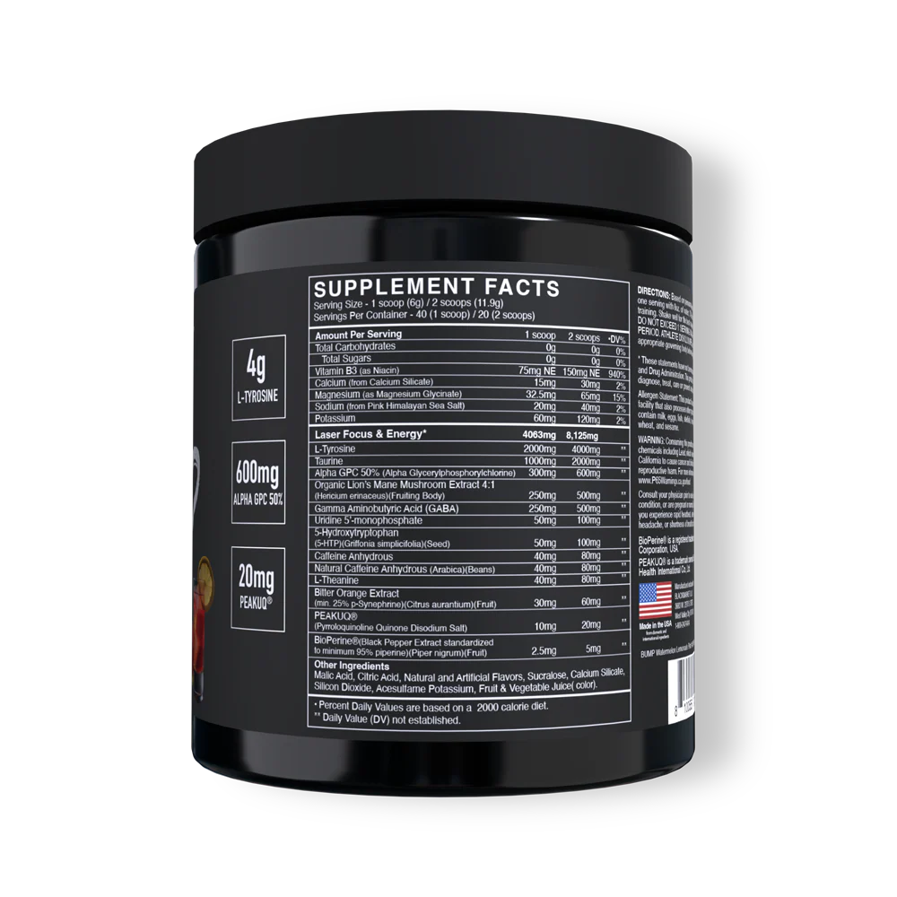 Featured Ingredient: L-Tyrosine, PEAKUQ®, Alpha GPC, GABA, Uridine 5'-monophosphate, 5-hydroxytryptophan, 80mg Caffeine.